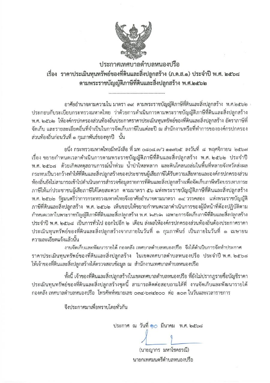 ประกาศ !! ราคาประเมินทุนทรัพย์ของที่ดินและสิ่งปลูกสร้าง (ภ.ด.ส.1) ประจำปี 2568