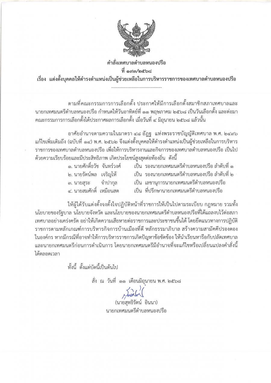 แต่งตั้งบุคคลให้ดำรงตำแหน่งเป็นผู้ช่วยเหลือในการบริหารราชการของ ทต.หนองปรือ