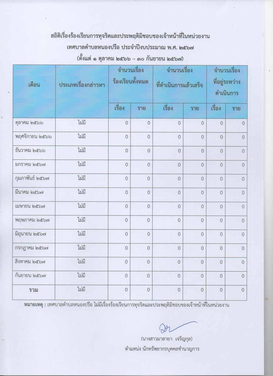สถิติร้องเรียนทุจริตประพฤติมิชอบของเจ้าหน้าที่เทศบาลตำบลหนองปรือ ประจำปี 2566